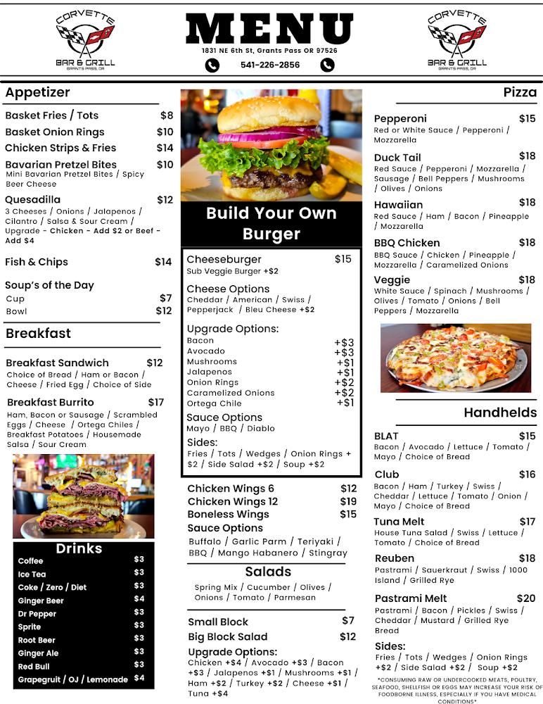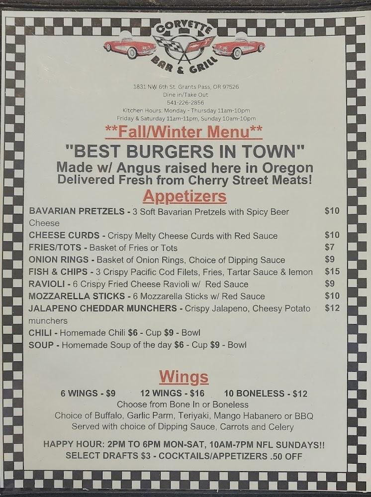 Welcome to Corvette Bar & Grill, your go-to destination in Grants Pass for mouthwatering American cuisine and an extensive selection of local and national beers and spirits. Enjoy live music while cheering for your favorite sports team or try your luck in our private gaming room featuring video poker and slots. Whether you’re looking to dine in, grab takeout, or enjoy a night out with friends, we offer quick service and a vibrant atmosphere. With accessible seating and amenities, Corvette Bar & Grill is perfect for everyone. Join us at 1831 NE 6th St for unforgettable meals and entertainment!